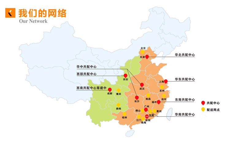 目前,公司在全國(guó)主要城市建立了多個(gè)大型共配中心,管理的倉(cāng)庫(kù)面積約40萬(wàn)平方米,業(yè)務(wù)區(qū)域涵蓋:華南、華東、華中、華北、西南地區(qū),配送服務(wù)網(wǎng)絡(luò)包括電商、KA、BC、批發(fā)、餐飲、特通等。